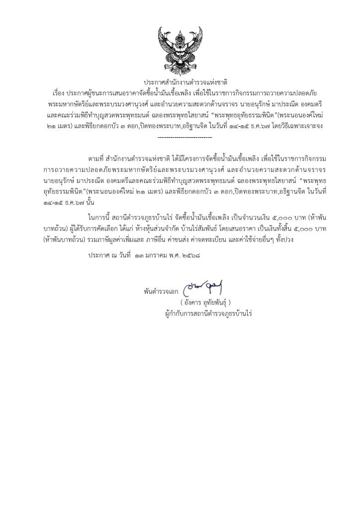 ประกาศจัดซื้อจัดจ้างเดือนมกราคม 2568 31 มกราคม 2568 โดย admin / ข่าวจัดซื้อจัดจ้าง,ไม่มีหมวดหมู่ ประกาศผู้ชนะซื้อนำ้มันเชื้อเพลิง ประกาศผู้ชนะซื้อนำ้มันเชื้อเพลิง เพื่อใช้ในราชการกิจกรรมการถวายความปลอดภัยพระมหากษัตริย์และพระบรมวงศานุวงศ์ และอำนวยความสะดวกด้านการจราจร นายอนุรักษ์ มาประณีต องคมนตรี FacebookFacebookXXLINELine