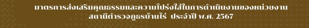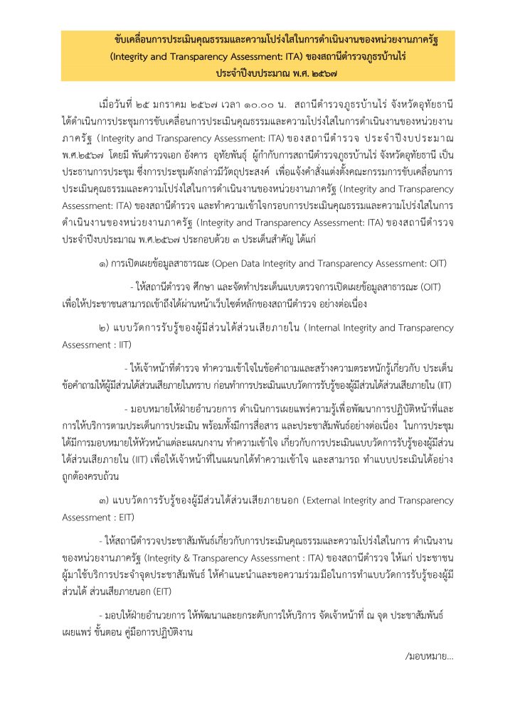 เมื่อวันที่ 25 มกราคม 2567 สถานีตำรวจภูธรบ้านไร่ จังหวัดอุทัยธานี ได้ดำเนินการประชุมการขับเคลื่อนการประเมินคุณธรรมและความโปร่งใสในการดำเนินงานของหน่วยงานภาครัฐ (Integrity and Transparency Assessment: ITA) ของสถานีตำรวจ ประจำปีงบประมาณ พ.ศ.๒๕๖๗ โดยมี พันตำรวจเอก อังคาร อุทัยพันธุ์ ผู้กำกับการสถานีตำรวจภูธรบ้านไร่ จังหวัดอุทัยธานี เป็นประธานการประชุม ซึ่งการประชุมดังกล่าวมีวัตถุประสงค์เพื่อทำความเข้าใจให้แก่ข้าราชการตำรวจในสถานีทุกนาย ได้รับทราบและถือปฏิบัติตามประกาศนโยบายการต่อต้านการรับสินบน (Anti-Bribery Policy) ของสถานีตำรวจ พร้อมทั้งปลูกฝังให้ข้าราชการตำรวจได้ปฏิบัติหน้าที่ด้วยความซื่อสัตย์ สุจริต อดทน อดกลั้น ให้บริการประชาชนอย่างเต็มกำลังความสามารถ พร้อมทั้งปลูกฝังให้ข้าราชการตำรวจปฏิบัติตามประมวลจริยธรรมและจรรยาบรรณตำรวจ