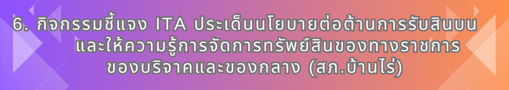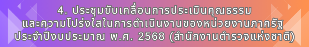 เมื่อวันที่ ๒๖ พฤศจิกายน ๒๕๖๗  เวลา ๐๙.๐๐ – ๑๖.๐๐ น. สำนักงานคณะกรรมการป้องกันและปราบปรามการทุจริตแห่งชาติ (ป.ป.ช.) ได้จัดกิจกรรมชี้แจงการประเมินคุณธรรมและความโปร่งใสในการดำเนินงานของหน่วยงานภาครัฐ (ITA) ของสถานีตำรวจ ปี ๒๕๖๘ ให้แก่ข้าราชการตำรวจในสังกัดสำนักงานตำรวจแห่งชาติ ผ่านระบบออนไลน์  ซึ่ง  ตำรวจภูธรภาค ๖ โดย พล.ต.ต.พงศธร เครียดธฤมาล ผบก.อก. เป็นประธาน พ.ต.อ.ศาสตรา อ่อนรัศมี รอง ผบก.อก.ภ.๖ พร้อมคณะทำงานฯ ภาค ๖ , รอง ผบก.ภ.จว.ทุกจังหวัดในสังกัด ภ.๖ ถ่ายทอดไปยัง ๑๔๗ สถานีตำรวจในสังกัดตำรวจภูธรภาค ๖
